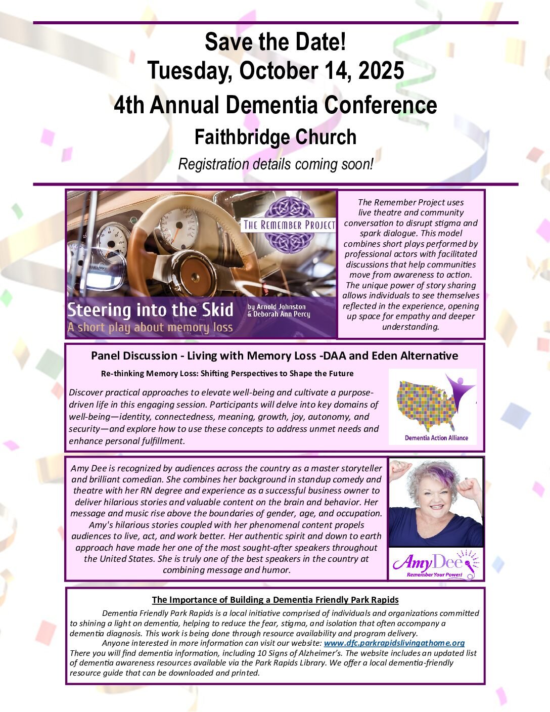 Join us for an inspiring and thought-provoking Dementia Conference that blends creativity, education, and empathy to challenge stigma and reshape our understanding of memory loss. Featuring The Remember Project, this event uses live theatre and community conversation to ignite dialogue and drive action. Through professional performances and guided discussions, attendees will explore the power of storytelling to foster empathy and connection.