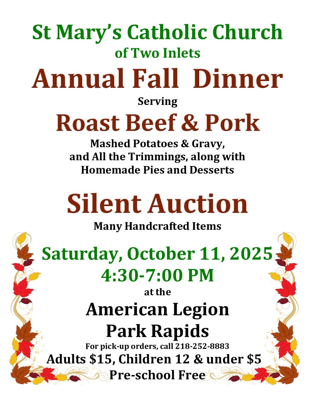 St. Mary’s Catholic Church of Two Inlets will be hosting their Annual Fall Dinner at the American Legion, serving Roast Beef and Pork with mashed potatoes& gravy, all the trimmings, plus homemade pies and desserts. There will also be a silent auction featuring many handcrafted items.