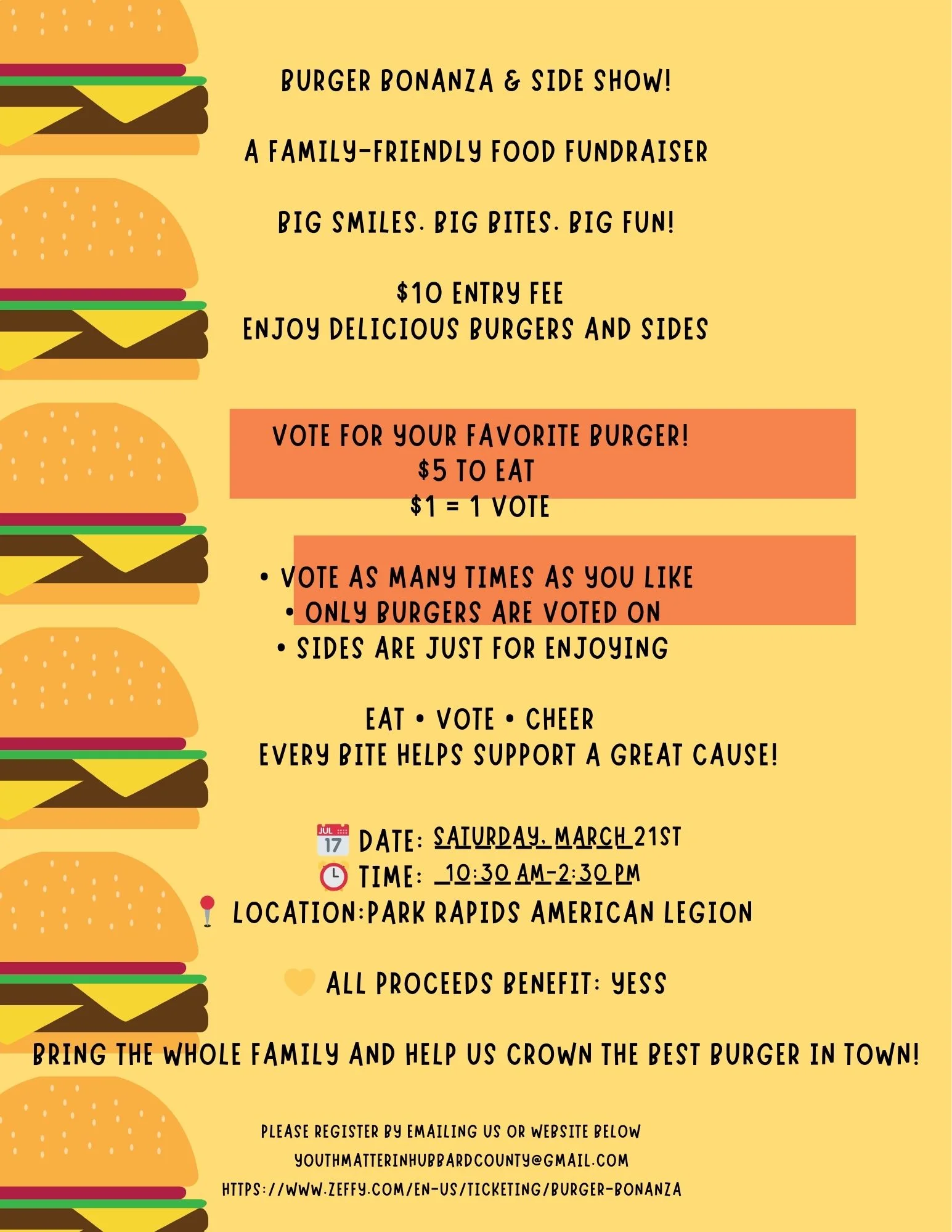 Big smiles. Big bites. Big fun! Join us for a family-friendly food fundraiser! $10 entry fee to enjoy a variety of delicious burgers and sides. Vote for your favorite burger, $5 to eat, $1=1 vote. Every bite helps support a great cause, and all proceeds benefit YESS. Bring the whole family and help us crown the best burger in town!
