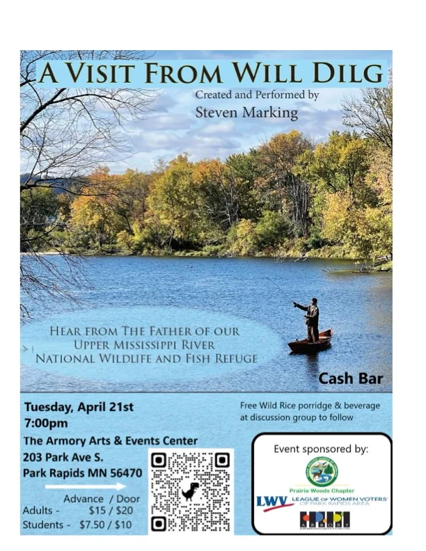 Created and performed by Steven Marking. Hear from the father of our Upper Mississippi River National Wildlife and Fish refuge. Free wild rice porridge and beverage at discussion group to follow. Ticketing Advance Tickets - Adults $15/ Students $7.50 Door Tickets - Adults $20/ Students $10
