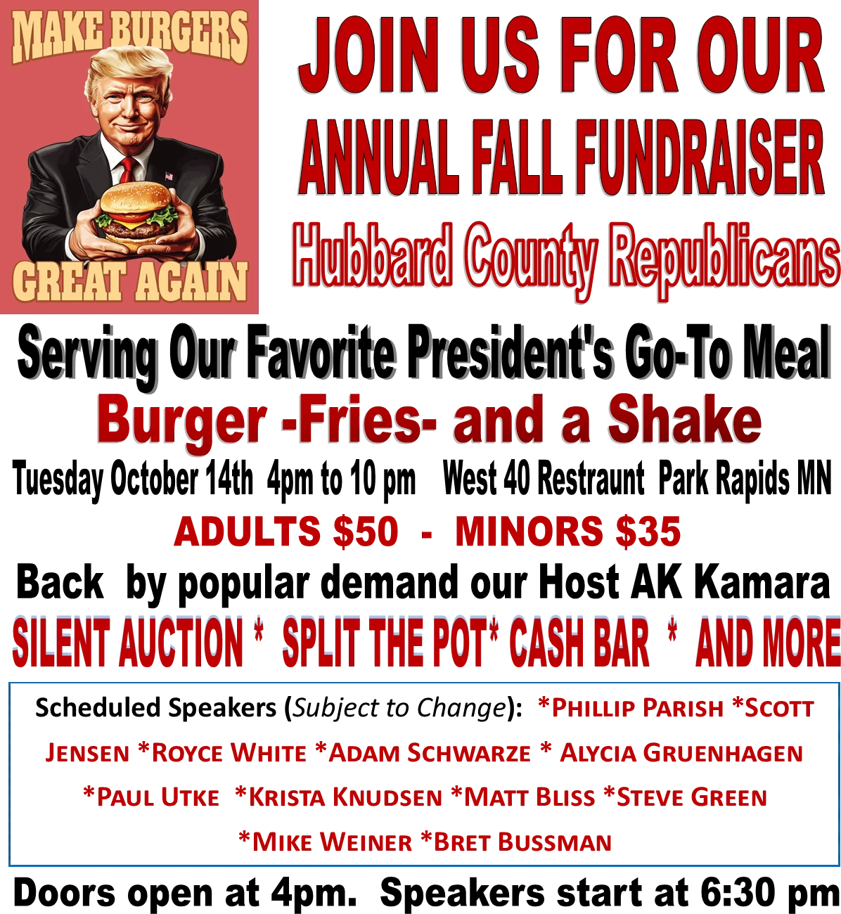 West Forty Restaurant 906 First St W, Park Rapids, MN, United StatesHubbard County GOP Fundraiser - Come meet from Your GOP Governor and US Senate Candidates: Including Royce White, Adam Schwarze and Phil Parrish Hosted by RNC Committeeman AK Kamara $50 for adults Young Republicans $30